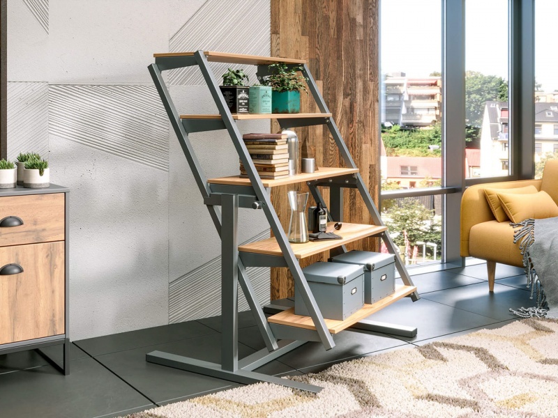 Преимущество стола в том, что в сложенном состоянии он занимает мало места и выполняет функцию стеллажа с пятью полками для хранения.