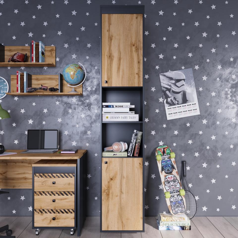 Природные фасады. Приятные фасады с текстурой натурального дерева добавят тепла в пространство комнаты. Безопасные материалы. Торцы корпуса и фасадов облицованы экологичной кромкой ABS, которая защищает грани от сколов, влаги, грязи. Два закрытых отделения с полкой. Предназначены для хранения сложенной детской одежды, книг. Открытое отделение с полкой. Здесь можно расставить школьные учебники, игрушки, предметы декора. Ручки-кнопки. Милые квадратные ручки покрыты безопасным эмалевым покрытием. Регулируемые опоры. Позволяют нивелировать неровности напольного покрытия комнаты. Качественная фурнитура c бессрочной гарантией от «Лазурит». Петли с доводчиками обеспечивают лёгкое открытие и плавное закрытие дверей.