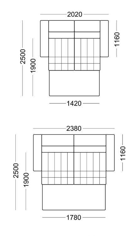 Габаритные размеры: 2380(2020)х1160х850-1050 мм