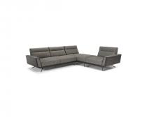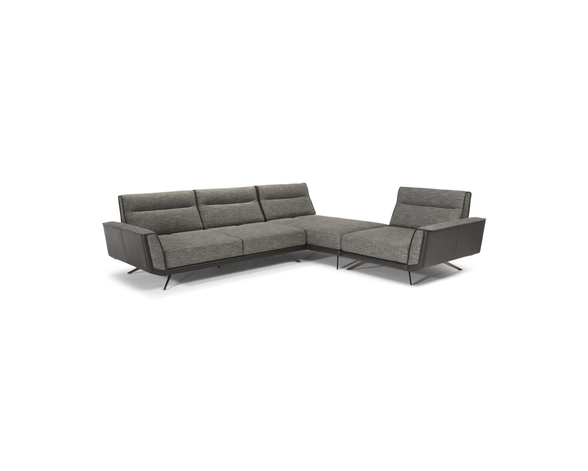 Подлокотники, прикрепленные к деревянным панелям, как и весь диван, можно заказать с обивкой из кожи, ткани или с комбинацией кожи и ткани с контрастным кантом, выбрав любой из более 100 цветов. Металлический ножки с черной блестящей отделкой характеризуются очень необычной косой формой.