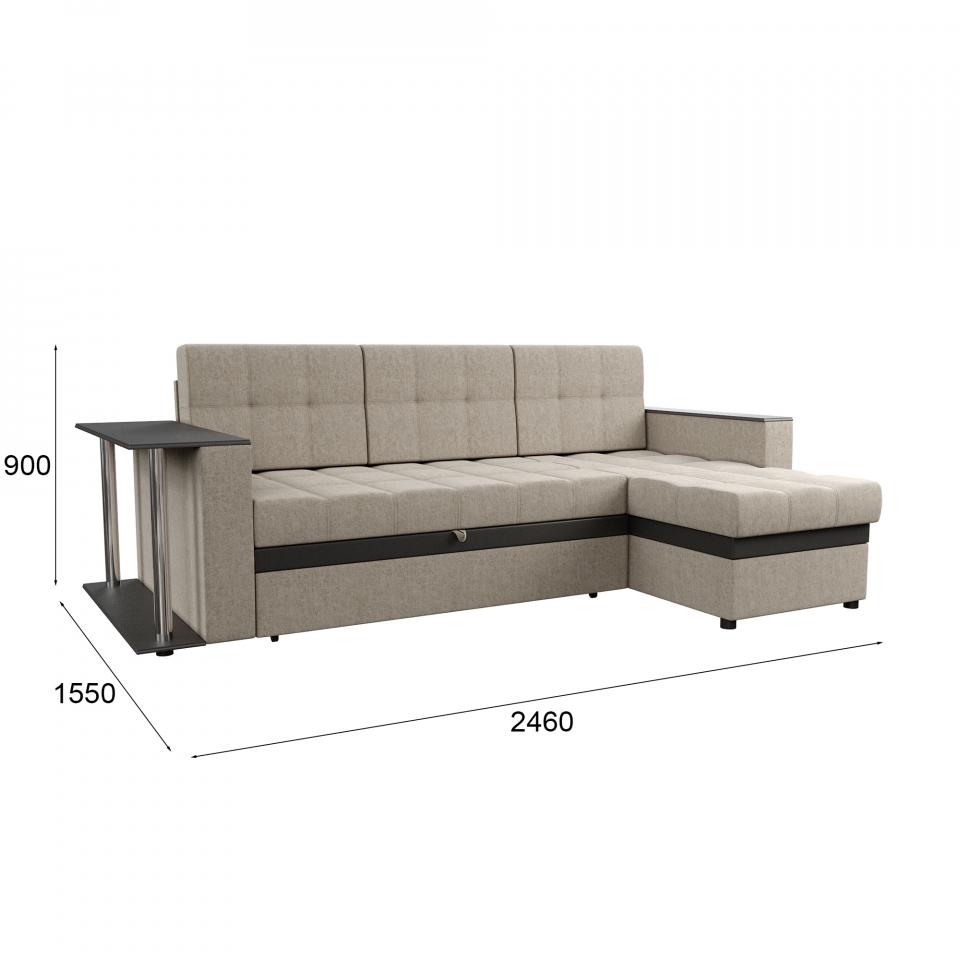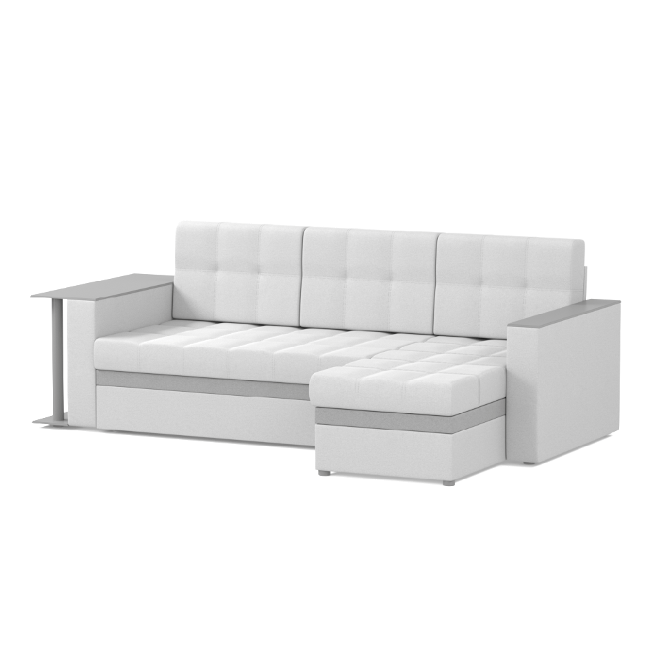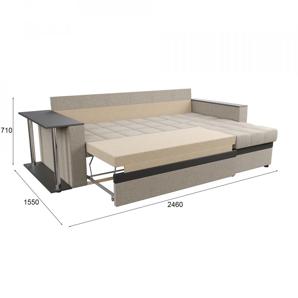 Универсальный угол. Диван подстроится под условия помещения — оттоманка устанавливается как слева, так и справа. Механизм трансформации «Дельфин». Диван легко и быстро превращается в кровать. Выдвиньте раму с дополнительным спальным местом из-под более широкой части дивана, потяните вверх и вперёд за специальную петлю. Подушка поднимется на уровень остальных частей дивана. Подушка выполнена в технической ткани, отличается от обивки по цвету и фактуре. Размер спального места — 1420 х 1960 мм. Полноценная кровать подойдёт для комфортного сна и отдыха одного-двух человек. Прочная конструкция и пружинящий эффект. Пружины «Змейка» в тандеме с пенополиуретаном формируют мягкую посадку с пружинящим эффектом, а также не задерживают влагу и проводят воздух, что увеличивает срок службы изделия. Обивка из велюра. Мягкая на ощупь ткань хорошо тянется и пропускает воздух. Для ухода используйте сухую чистку или химчистку, не используйте абразивные средства. 3 приспинные подушки. Помогут скорректировать глубину посадки и сделают отдых ещё комфортнее. Короб для белья. В оттоманке дивана скрыт просторный бельевой ящик, в котором можно разместить все необходимые постельные принадлежности. Декоративный столик и накладка на подлокотник. Во время отдыха на диване не придётся тянуться к журнальному столику за смартфоном или чашкой чая.