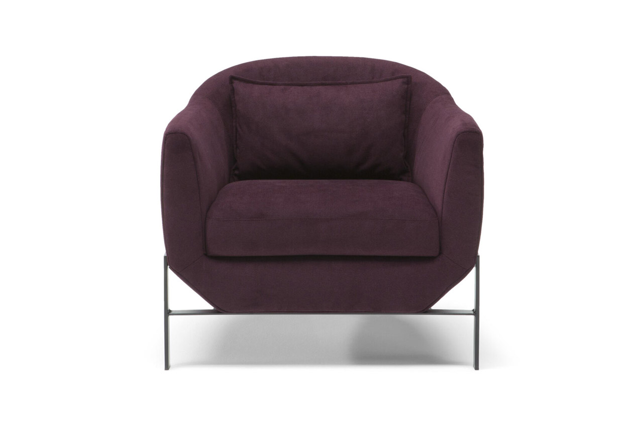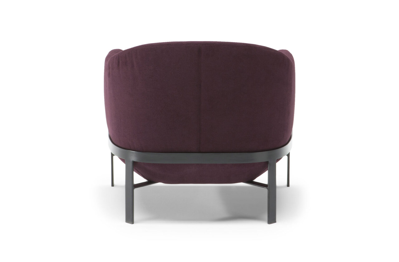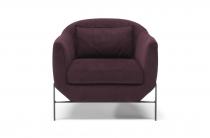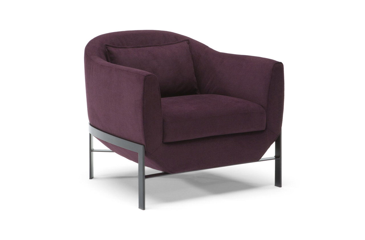 Компактное кресло Poli с привлекающим внимание дизайном в форме раковины укреплено металлической конструкцией, обрамляющей сиденье.