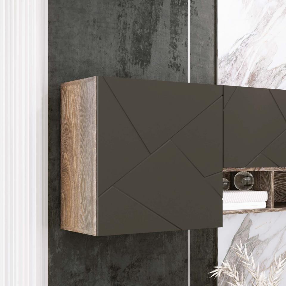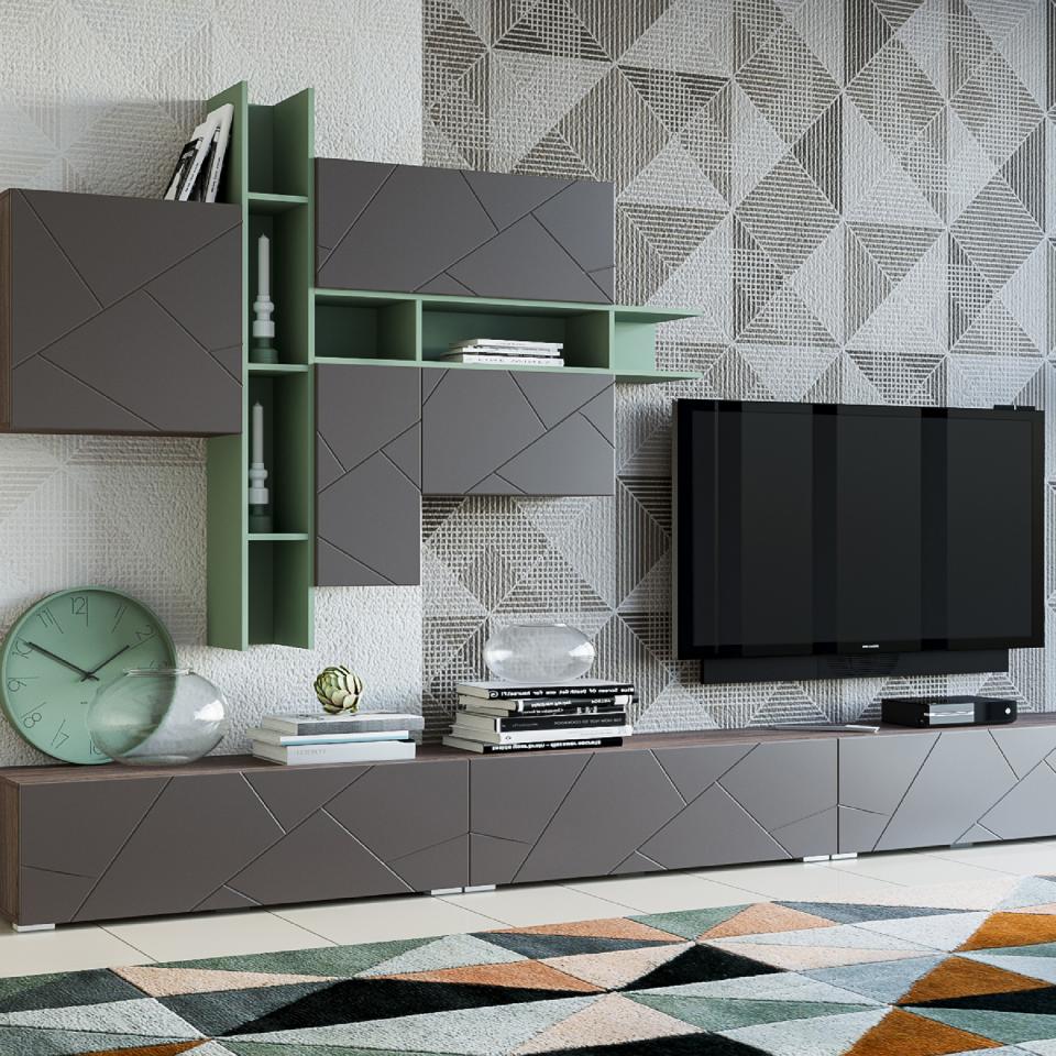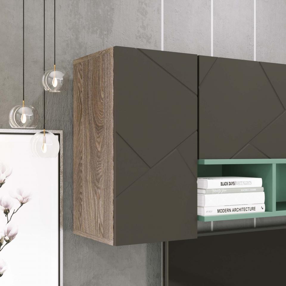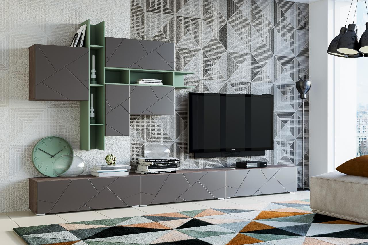 Особенности. Закрытые отделения шкафов и тумб. Идеально подойдут для хранения книг и вещей. Открытые полки. Множество полок позволит красиво расставить рамки с семейными фотографиями, статуэтки и сувениры. Асимметрия из прямых линий, сплошных и правильных форм корпуса — характерная черта дизайна коллекции. Фасады, стилизованные под колотый камень, одновременно являются декоративными элементами. Полное отсутствие ручек на фасадах шкафов и ящиков в пользу механизма открывания Push to open. Надёжная фурнитура от ведущих европейских производителей c пожизненной гарантией от «Лазурит».