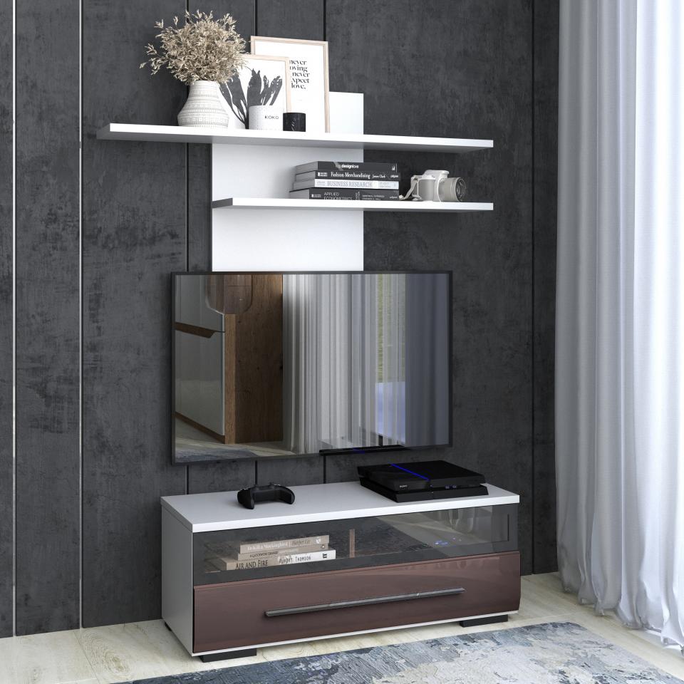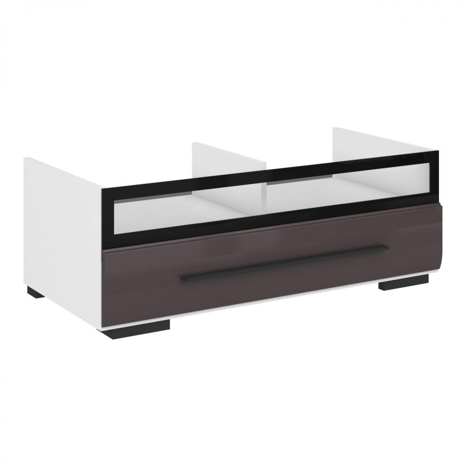 Глянцевый фасад. Покрыт лаком с эффектом «высокий глянец», который делает поверхность идеально гладкой, почти зеркальной, стильно дополняя дизайн модели. Вместительный ящик со стеклянной панелью. В нем будет удобно хранить аксессуары, а на полках без задней стенки можно установить мультимедиа аппаратуру или игровую консоль. Направляющие с доводчиками. Устанавливаются на дно ящика и при открывании не видны. Доводчики в системе обеспечивают плавное бесшумное открывание и закрывание ящика. Надёжная фурнитура c бессрочной гарантией от «Лазурит». Обеспечивает лёгкое выдвижение ящика.
