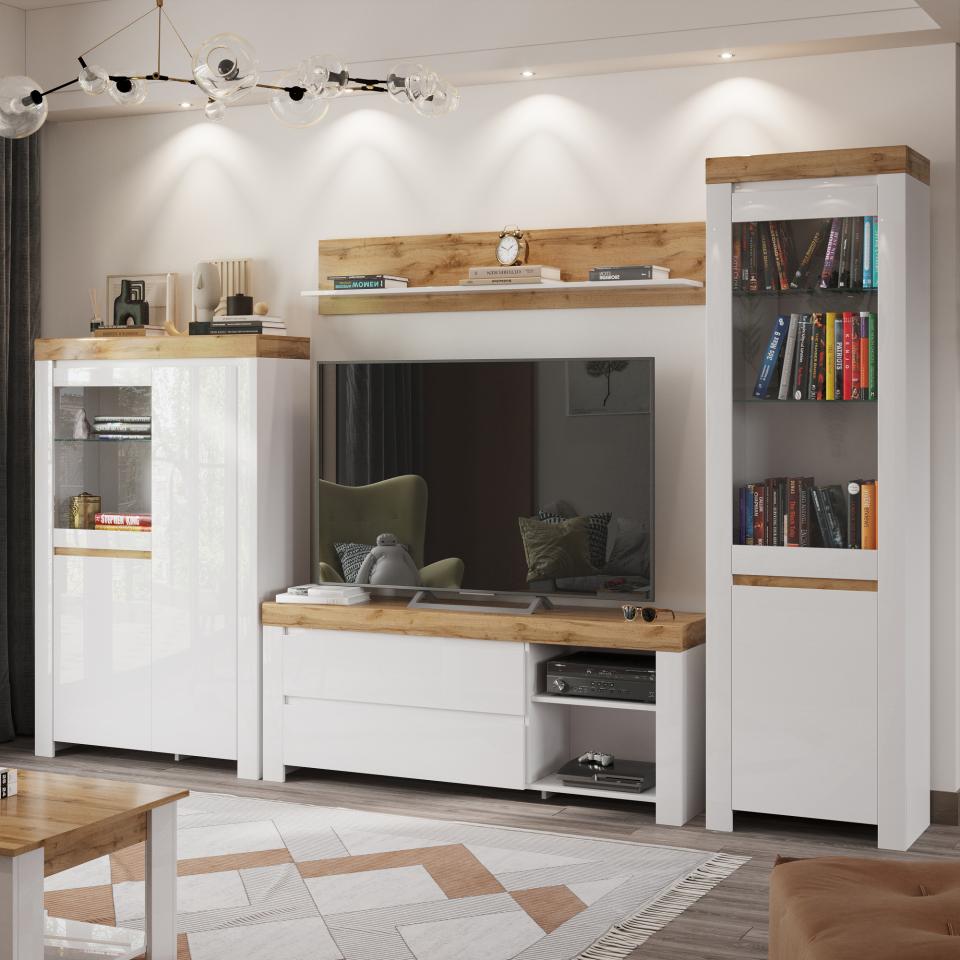 Сочетание цветов и фактур. Белые глянцевые фасады в сочетании с фактурой натурального дерева подарят вашему интерьеру безупречно стильный акцент. Отсутствие ручек. Ящики и дверцы открываются с помощью внутренней фрезеровки фасадов. Отсутствие ручек придаёт модели аккуратный и лаконичный вид. Сочетание ящика и закрытых полок. В отделениях много места для хранения тв-аксессуаров, документов и других важных вещей. Вместительная столешница. На широкой столешнице поместится телевизор диагональю до 65 дюймов и весом до 15 кг. Качественная фурнитура c бессрочной гарантией от «Лазурит». Петли с доводчиками обеспечивают удобное открытие и плавное закрытие дверей.