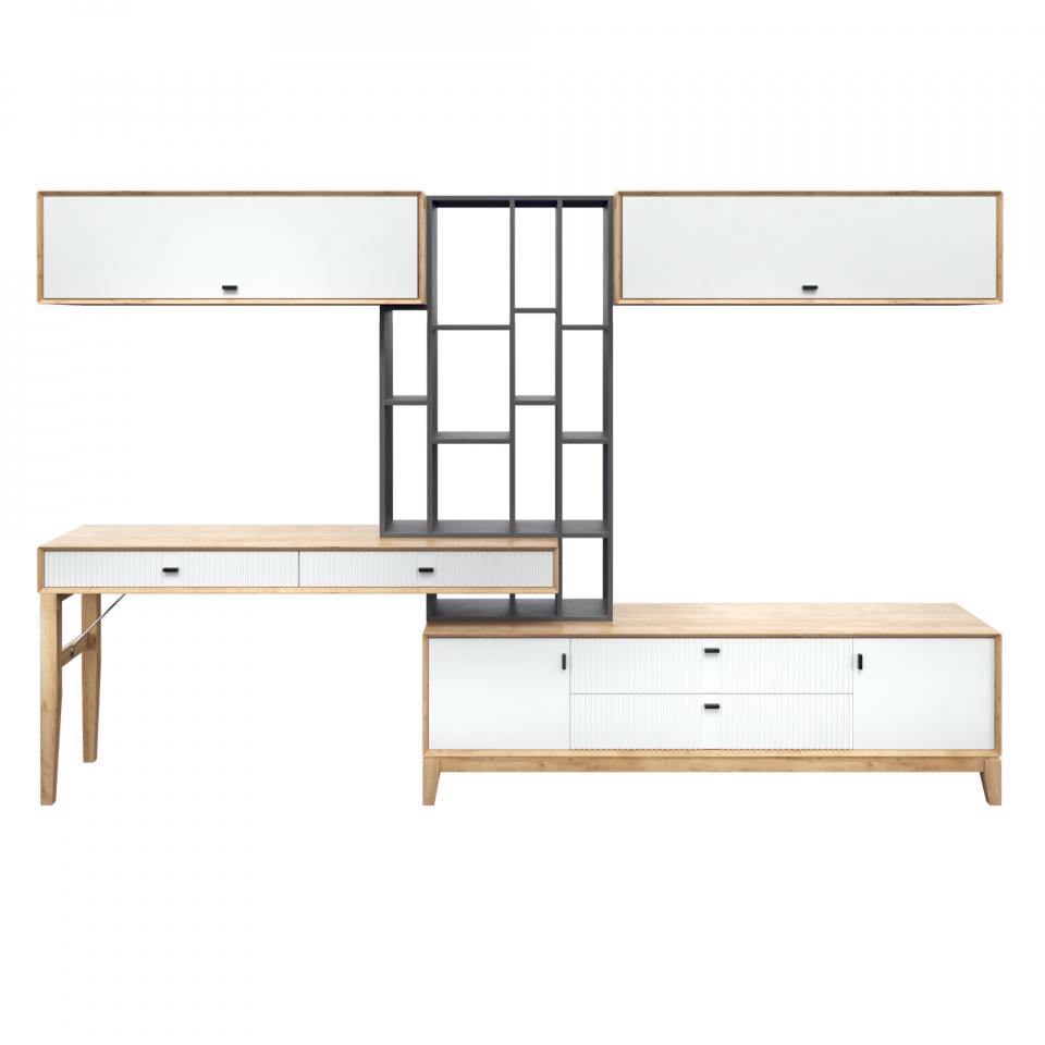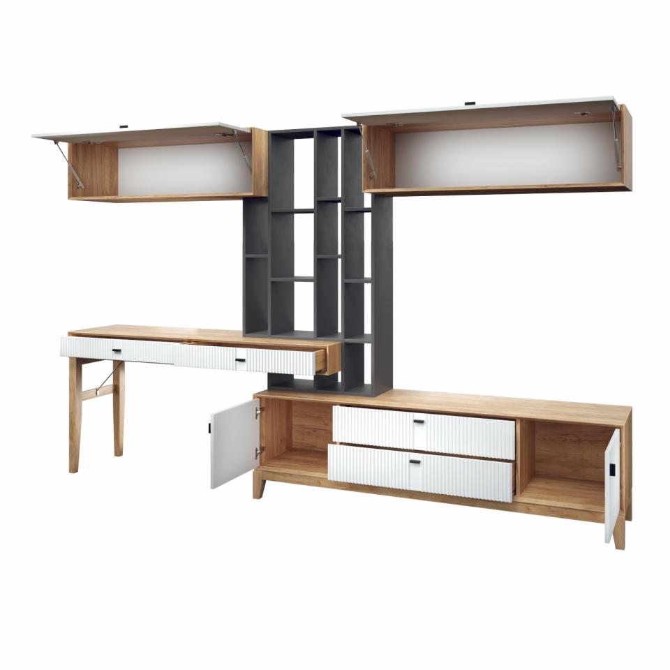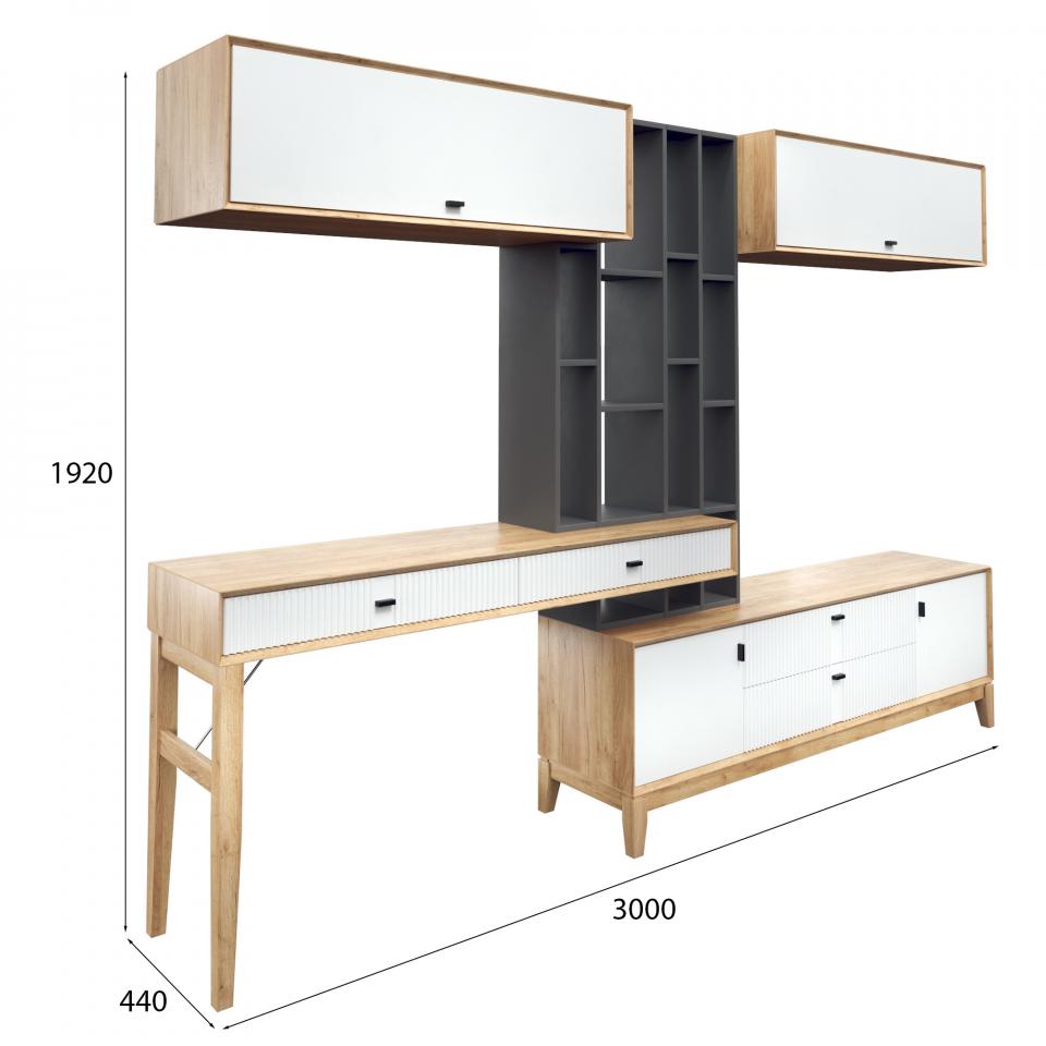 Сборка под углом 45°. Благодаря особой конструкции вертикальных и горизонтальных стенок стыки практически незаметны. Два навесных шкафа. Предназначены для хранения книг и различных предметов. Вертикальный стеллаж с полками. На многочисленных полках можно расставить уютные предметы декора. Стол-консоль с двумя ящиками. Комфортное место для работы с ноутбуком и документами прямо в гостиной. Тумба с отделениями и ящиками. На тумбе легко поместится большой телевизор с диагональю от 50 см, игровая консоль, саундбар. В закрытых отделениях можно хранить игровые и ТВ-аксессуары, в двух ящиках – подборки дисков с фильмами, видеоиграми. Матовые фасады. Фасады навесных шкафов и тумбы имеют приятное ровное покрытие, в то время как панели ящиков декорированы фрезеровкой-гребенкой. Прочные ножки. Яркий элемент декора и крепкие опоры для всей конструкции стенки. Надёжная фурнитура. На механизмы открывания распространяется бессрочная гарантия от «Лазурит».
