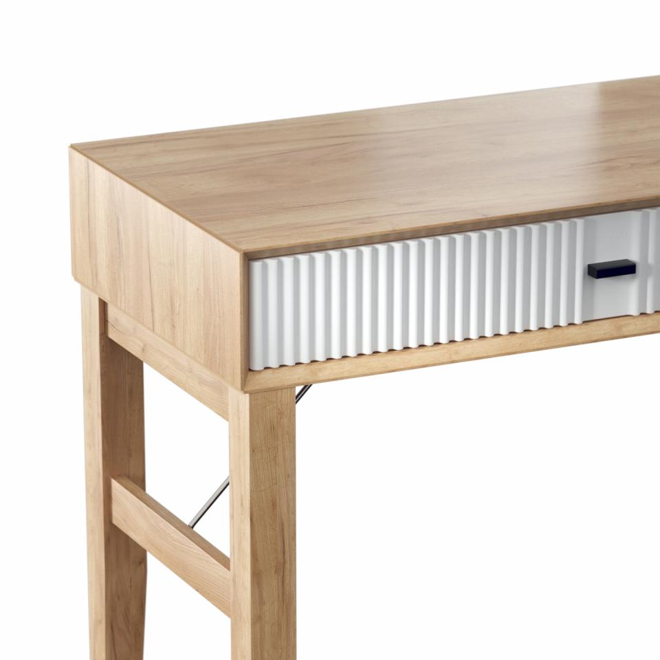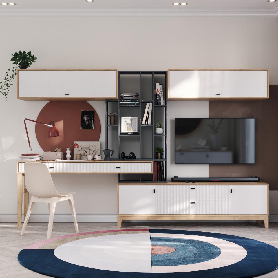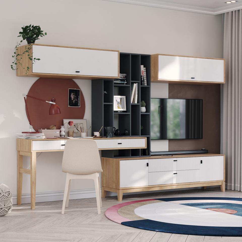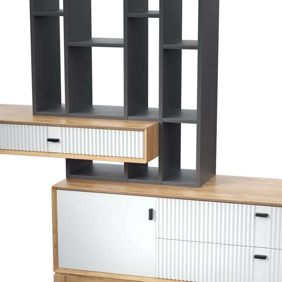 Сборка под углом 45°. Благодаря особой конструкции вертикальных и горизонтальных стенок стыки практически незаметны. Два навесных шкафа. Предназначены для хранения книг и различных предметов. Вертикальный стеллаж с полками. На многочисленных полках можно расставить уютные предметы декора. Стол-консоль с двумя ящиками. Комфортное место для работы с ноутбуком и документами прямо в гостиной. Тумба с отделениями и ящиками. На тумбе легко поместится большой телевизор с диагональю от 50 см, игровая консоль, саундбар. В закрытых отделениях можно хранить игровые и ТВ-аксессуары, в двух ящиках – подборки дисков с фильмами, видеоиграми. Матовые фасады. Фасады навесных шкафов и тумбы имеют приятное ровное покрытие, в то время как панели ящиков декорированы фрезеровкой-гребенкой. Прочные ножки. Яркий элемент декора и крепкие опоры для всей конструкции стенки. Надёжная фурнитура. На механизмы открывания распространяется бессрочная гарантия от «Лазурит».