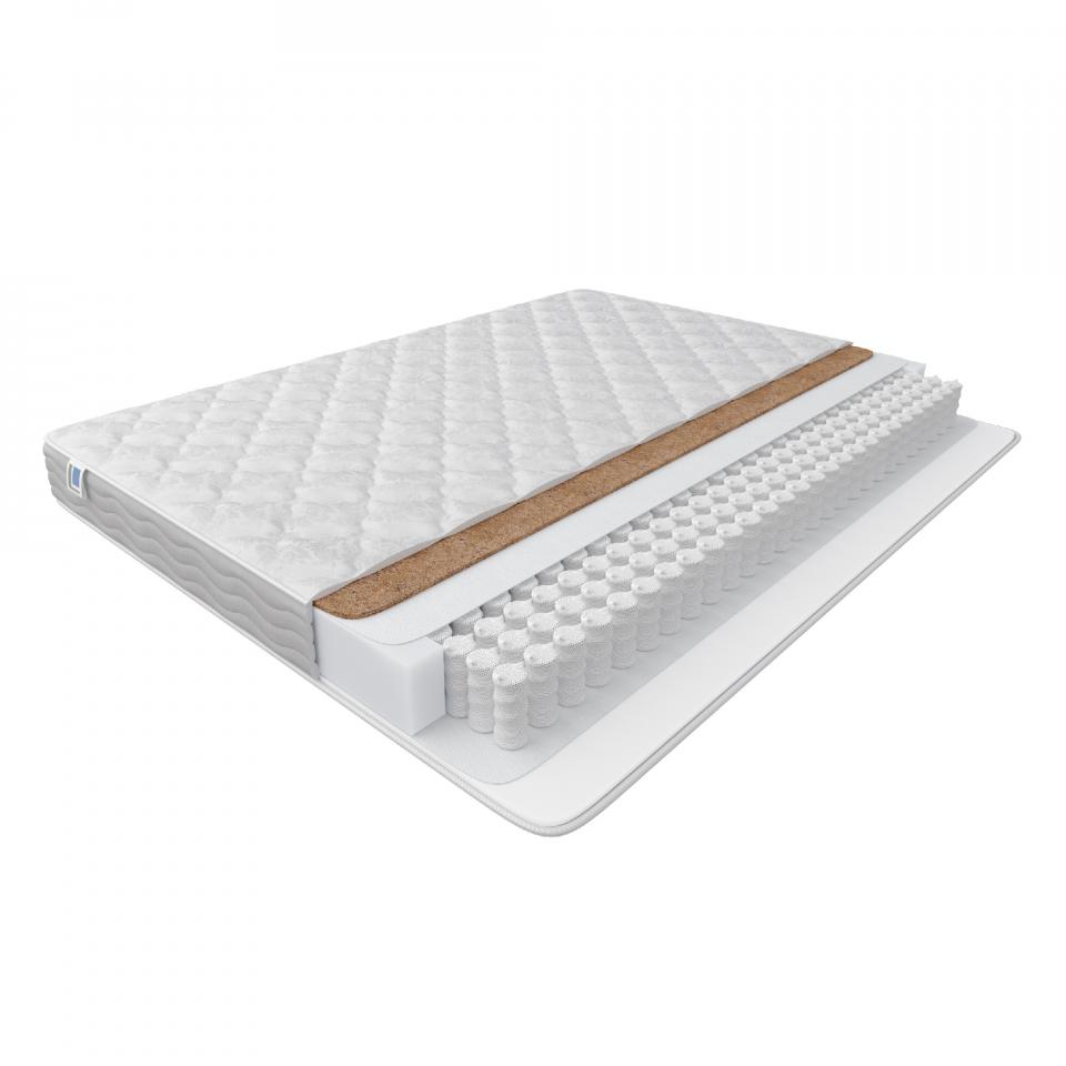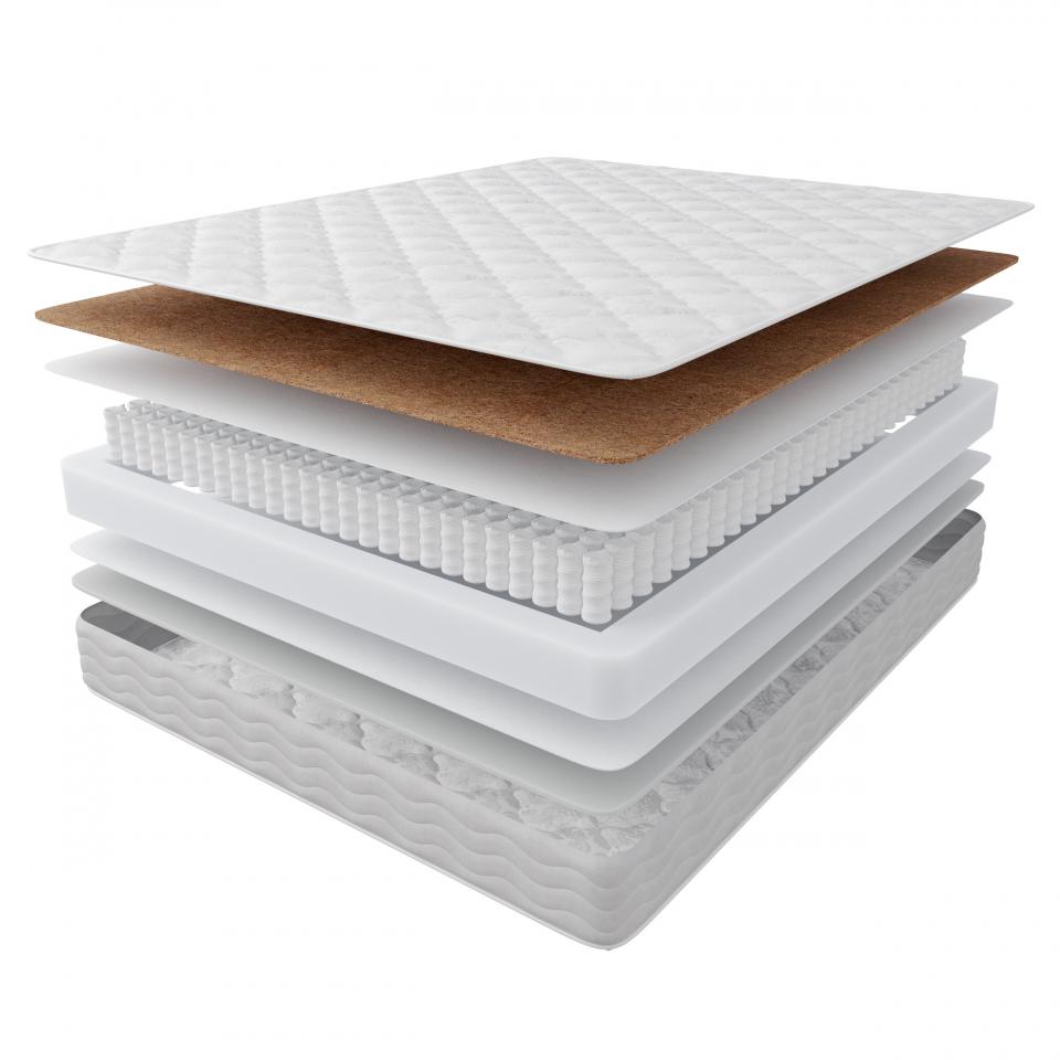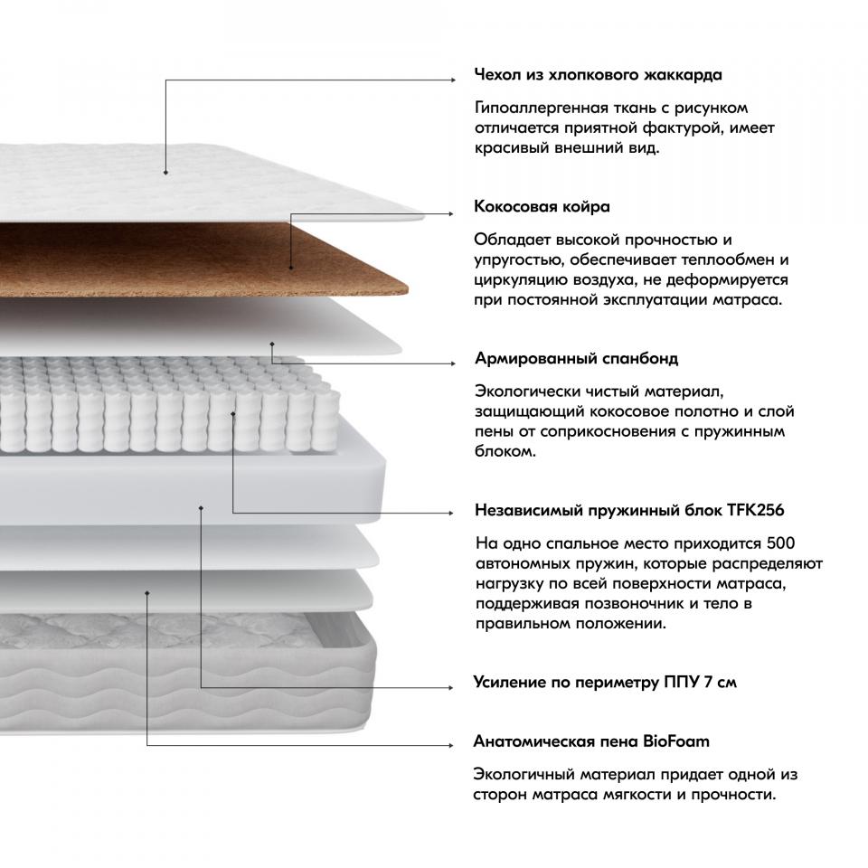 Чехол из хлопкового жаккарда. Гипоаллергенная ткань с рисунком отличается приятной фактурой, имеет красивый внешний вид. Кокосовая койра. Современный наполнитель обладает высокой прочностью и упругостью. Материал обеспечивает теплообмен и циркуляцию воздуха, не деформируется при постоянной эксплуатации матраса. Независимый пружинный блок TFK256. На спальное место приходится 500 пружин, которые распределяют нагрузку по всей поверхности матраса, формируя оптимальную поддержку тела. Каждая пружина заключена в защитный мешочек из спанбонда и принимает нагрузку автономно от других пружин, что исключает эффекты «подкатывания» и «волны». Анатомическая пена BioFoam. Экологичный материал придает одной из сторон матраса мягкости и прочности. Армированный спанбонд. Экологически чистый материал, защищающий кокосовое полотно и слой пены от соприкосновения с пружинным блоком.