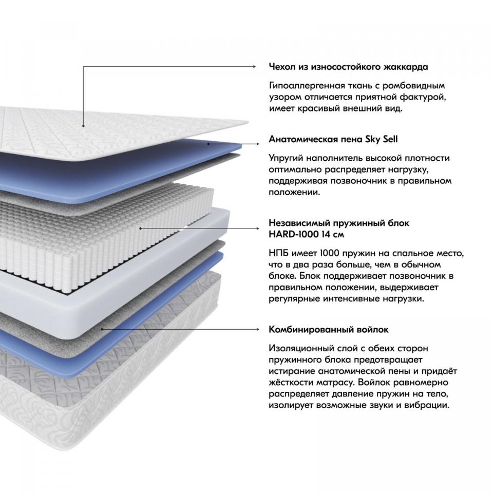 Независимый пружинный блок HARD-1000 14 см. НПБ имеет 1000 пружин на спальное место, что в два раза больше, чем в обычном блоке. Блок поддерживает позвоночник в правильном положении, выдерживает регулярные интенсивные нагрузки.