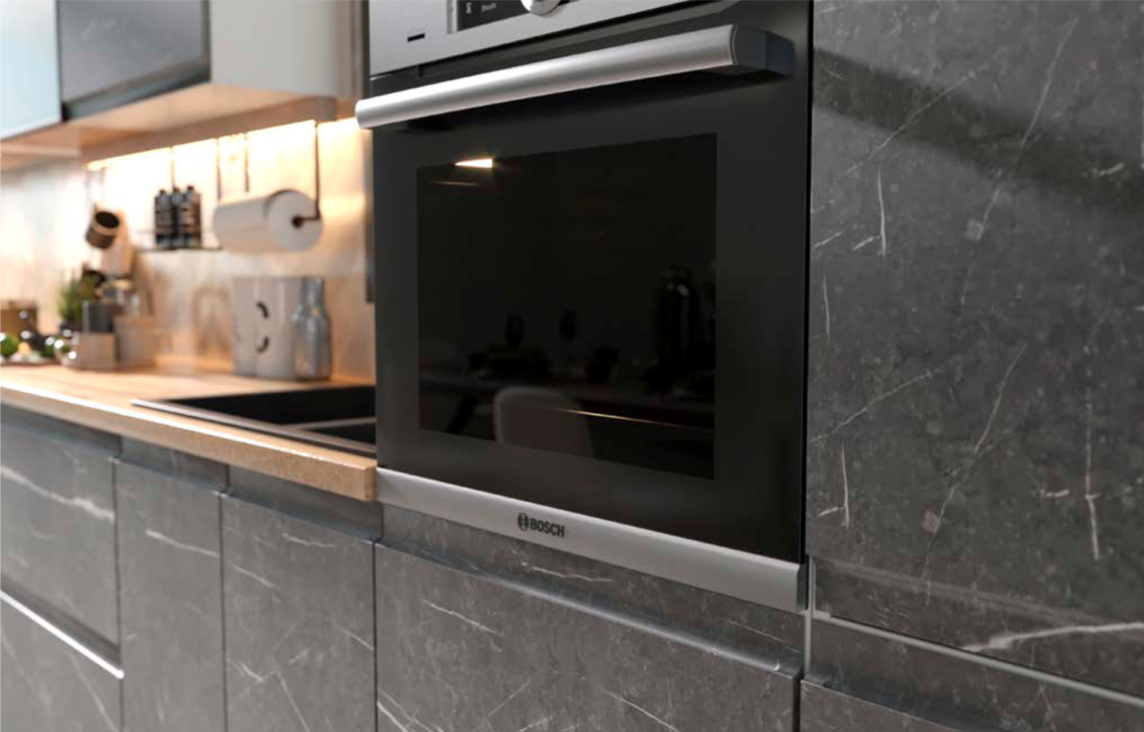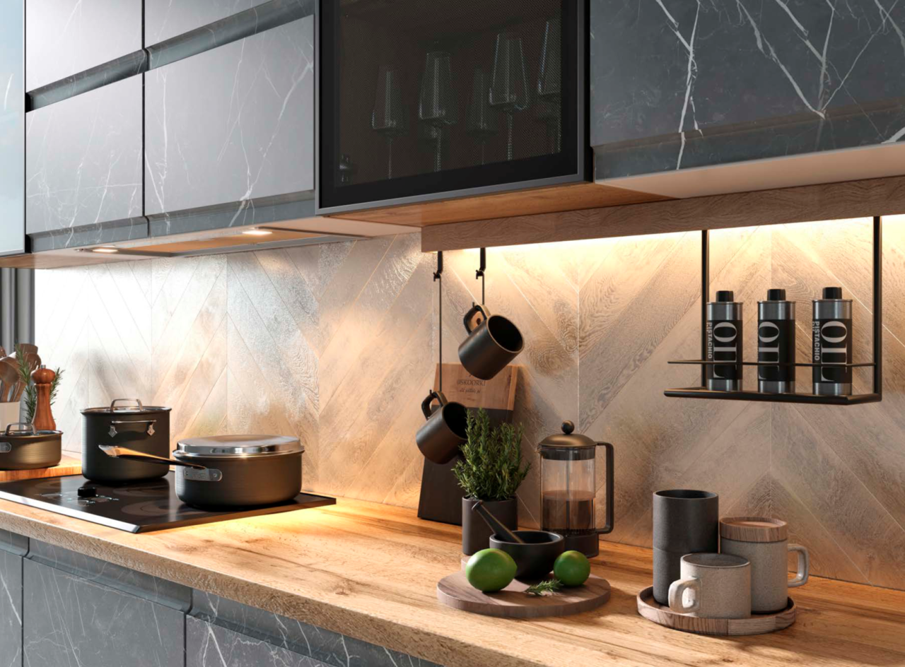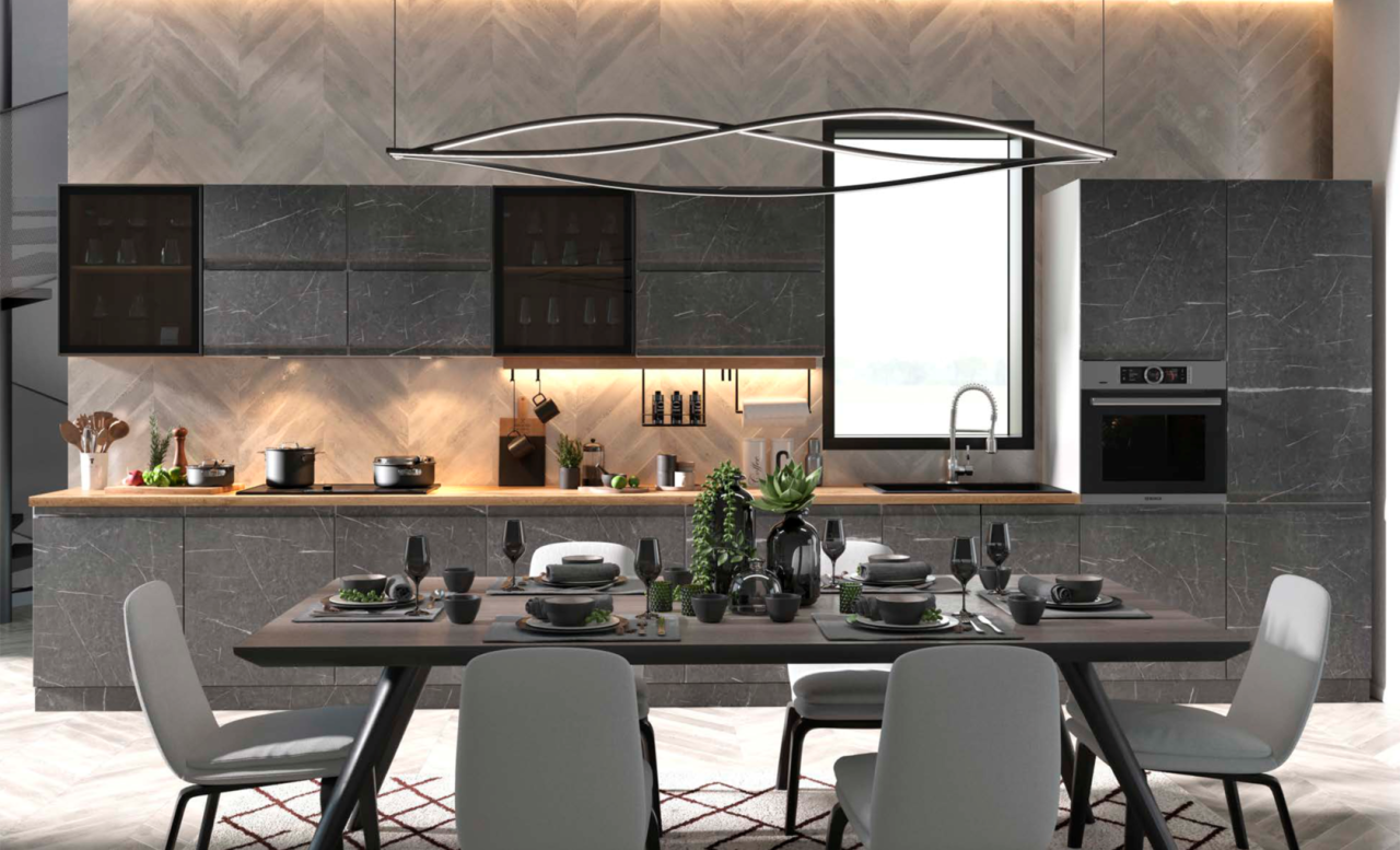 Благодаря новейшим стильным фасадам «HAND-LESS» С ФАКТУРОЙ ПРИРОДНОГО КАМНЯ В ЦВЕТе Nero , white, grey вызывает огромный интерес. Кухню можно дополнить метелло-каркасными корпусами со стеклом, а также бокс-вставками.