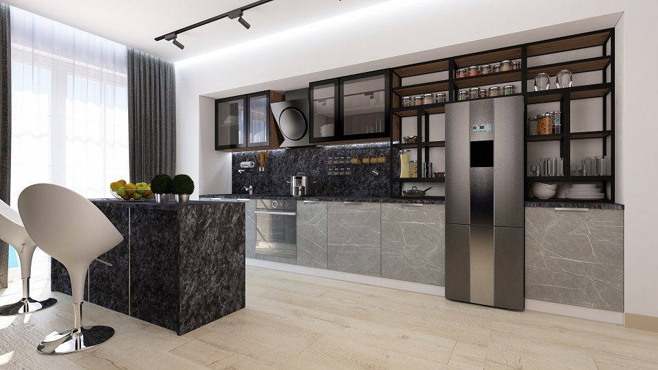 Износостойкие и долговечные фасады мдф, рамочные фасады BLACK/WHITE ИЗ МЕТАЛЛА С ШЕЛКОГРАФИЕЙ НА СТЕКЛЕ, интегрированная ручка INSIDE.