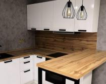Корпус кухни «Аляска» призводится из ЛДСП «Lamarty» , фасады изготавливаются из мдф kastamonu. Кухни комплектуются стеклами с полированной еврокромкой, в ящиках направляющие полного выдвижения, возможна комплектация с доводчиками фирмы boyard.Используются газовые лифты фирмы «Hafele».