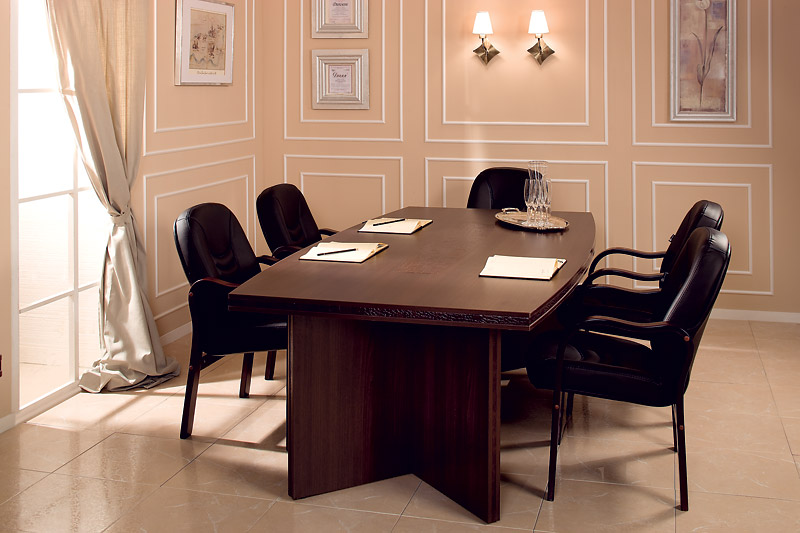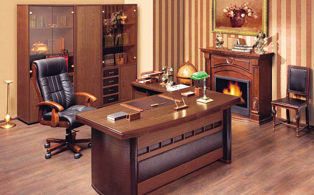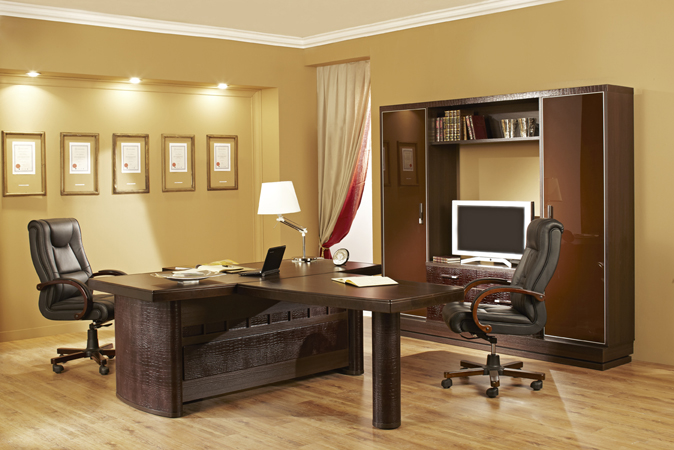 Кромка стола руководителя из натурального дерева; вставки из кожи "Арпатек"; наличие распашной винотеки, тумбы с потайным мини-баром, журнального стола с раздвижной столешницей, оригинальной стенки шкафов; два вида стеклянных дверей.