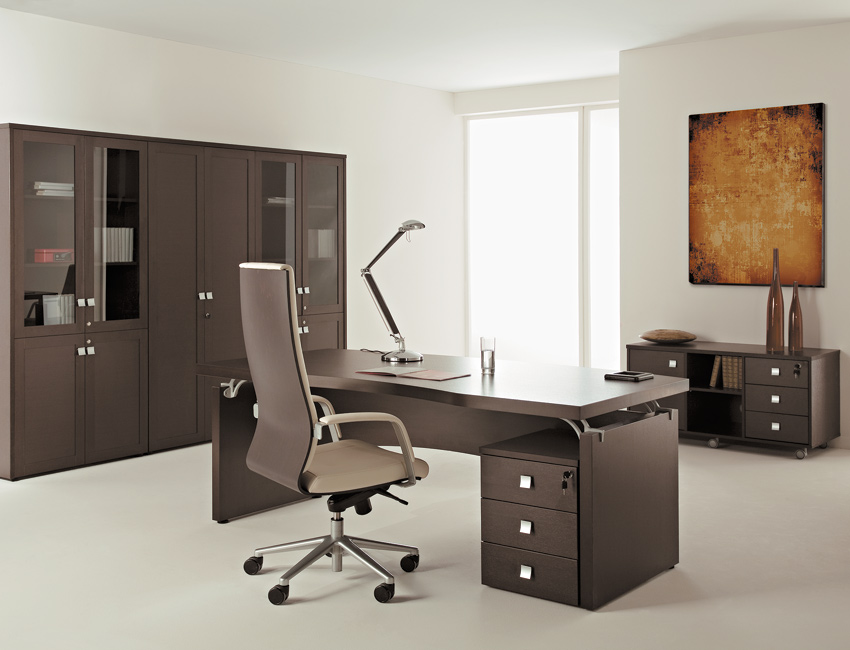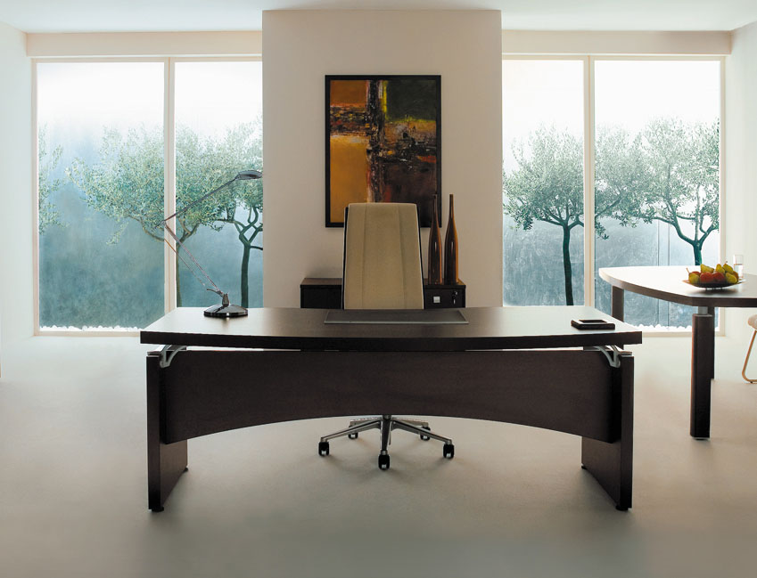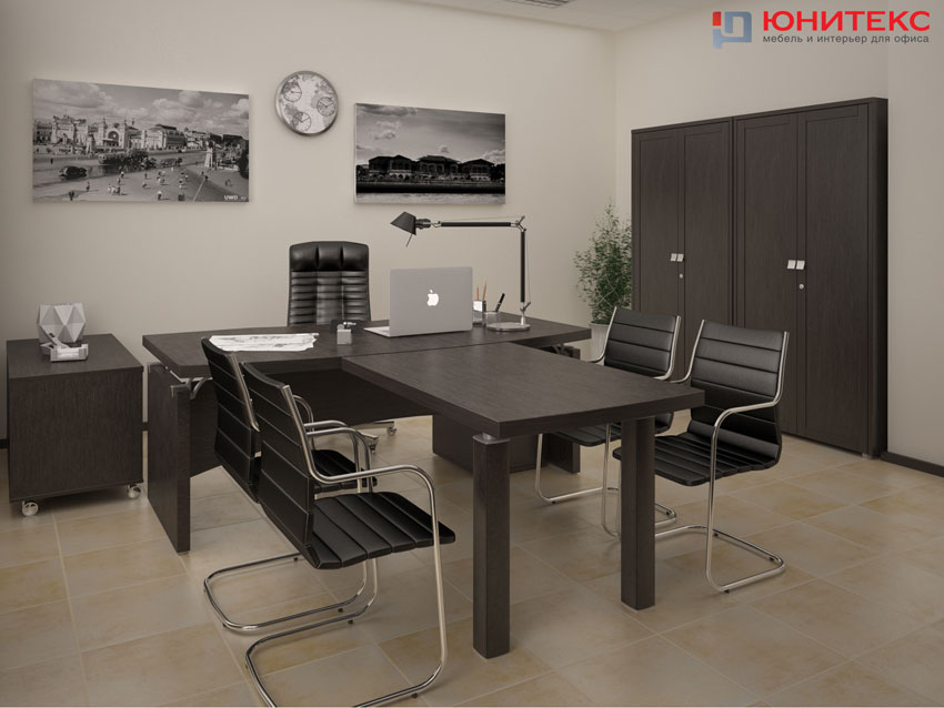 Особенности: металлические кронштейны столешниц; металлические опоры брифинг-приставки и столов переговоров с декоративными элементами.