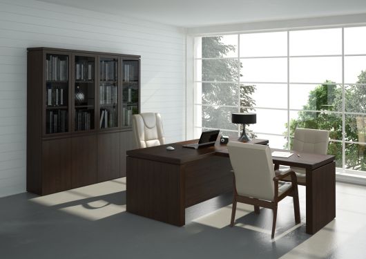 Все фасадные элементы изделий обложены массивом твердолиственных пород древесины толщиной 10 мм, придающим кабинету более дорогой статусный внешний вид. Все рабочие горизонтальные поверхности столов, приставных элементов, брифинг-приставок, подверженные повышенному износу, облицовываются высококачественным пластиком HPL в цвет ЛДСтП, повышающим прочностные характеристики лицевого покрытия. Выверенную геометрию подчеркивают ручки, выполненные из массива древесины, используемые на всех видах шкафов и тумб кабинета. Стеклянные двери также исполнены в рамке из массива древесины, а с торцевой стороны рамки предусмотрена ручка, расположенная вдоль всей ширины дверцы, выполненная также из массива.