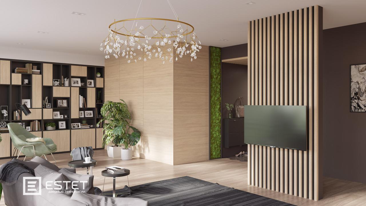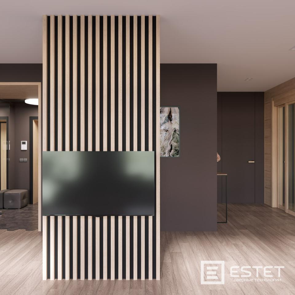 Популярное направление использования декоративных реек — разделение пространства. Посмотрите, как это выглядит в готовом интерьере! В данном случае в качестве отделок использованы покрытия под камень и дерево. Благодаря тому, что для финишной отделки применяются те же материалы, что и при производстве дверей, добиться единства стиля в интерьере невероятно легко. Рейки преображают пространство офиса, придавая ему энергичный ритм и оригинальную эстетику.
