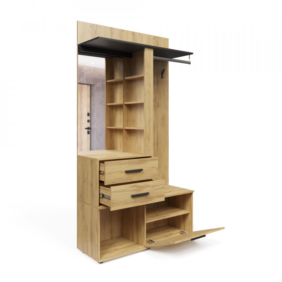 Оригинальный дизайн с «характером». Модуль создан в соответствии со всеми правилами эргономики: он практичен и функционален, обладает собственным стилем и харизмой. Декор дуба с текстурой натуральной древесины. Подходит к интерьеру в стиле лофт, оформленному в натуральной, природной цветовой гамме. Верхняя полка. Идеальное место для головных уборов, лишних сумок и коробок. Зеркало с верхней подсветкой. Позволит оценить и изменить свой образ перед выходом из дома. Боковые полочки. Предназначены для мелких аксессуаров или украшения предметами декора. Штанга и три крючка. Классические приспособления для размещения верхней одежды, сумок и зонтов. Два выдвижных ящика. В ящиках достаточно места для личных вещей и полезных аксессуаров. Тумба для обуви. За откидной дверцей с магнитной защёлкой можно хранить разную сезонную обувь. Открытая ниша. Отлично подходит для домашних тапок или коробок с обувью. Надёжная фурнитура. На механизмы действует пожизненная гарантия от «Лазурит».