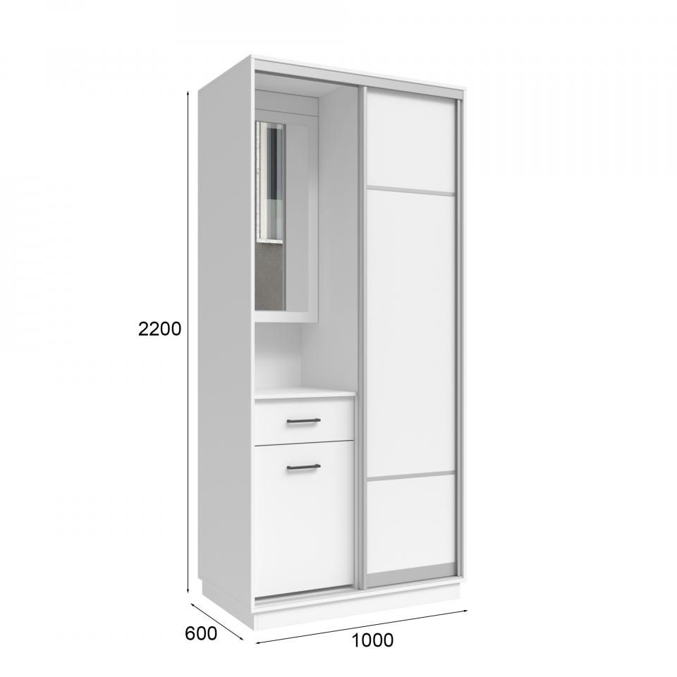 Отделение с зеркалом и тумбой. Закрытое отделение с тремя полками и ящик станут идеальным местом для хранения аксессуаров, парфюма и других небольших вещей. Под ящиком находится отделение с двумя нишами для хранения домашней и уличной обуви.