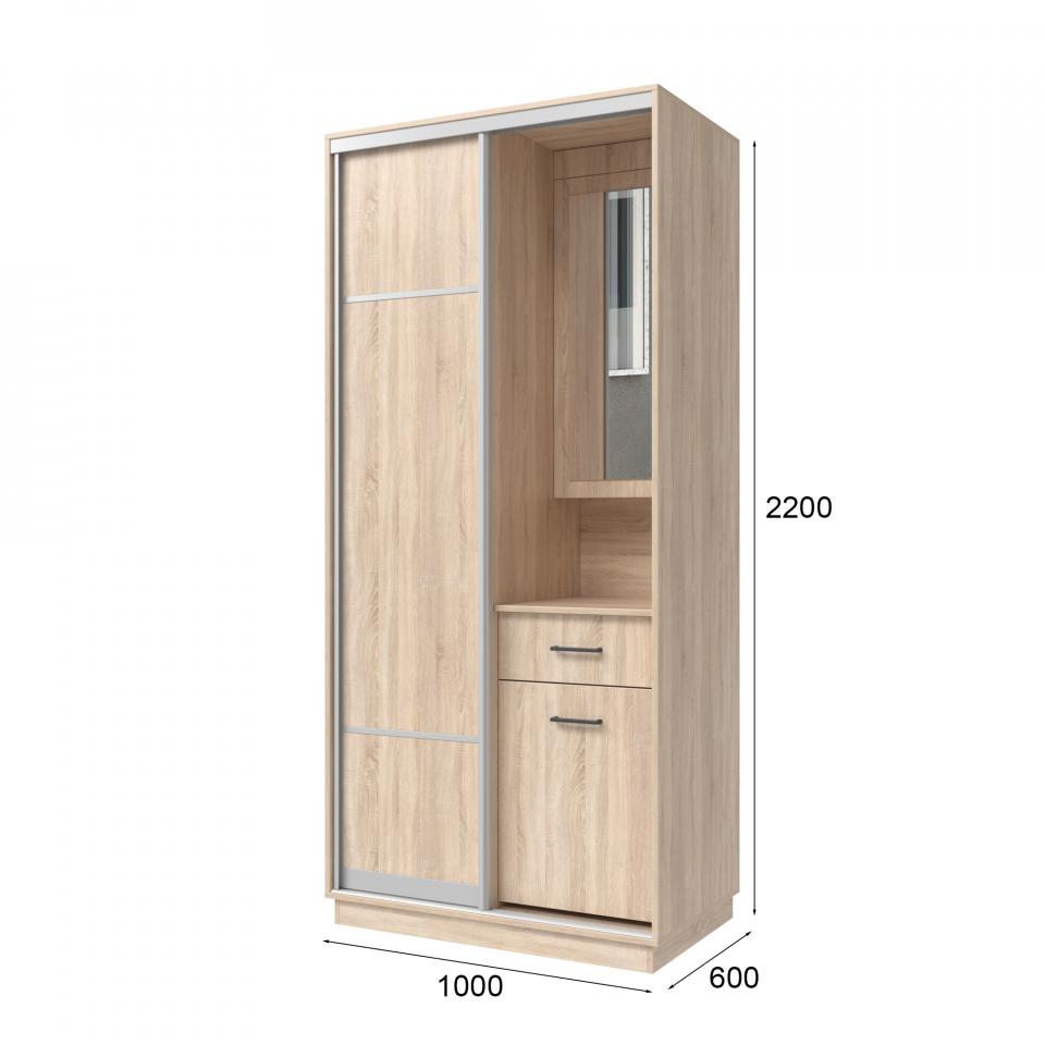 Отделение с зеркалом и тумбой. Закрытое отделение с тремя полками и ящик станут идеальным местом для хранения аксессуаров, парфюма и других небольших вещей. Под ящиком находится отделение с двумя нишами для хранения домашней и уличной обуви.