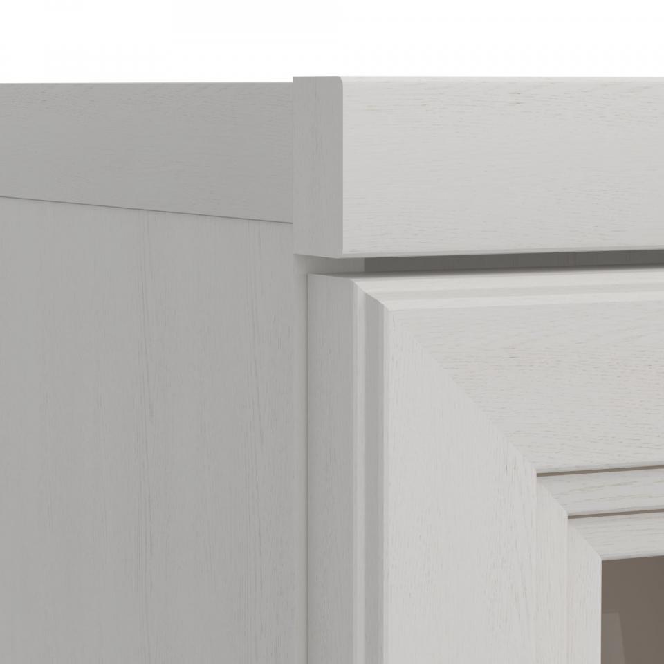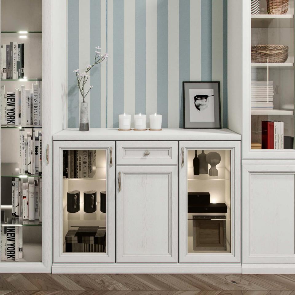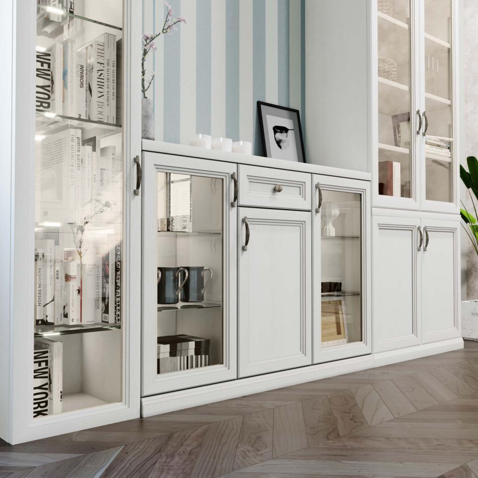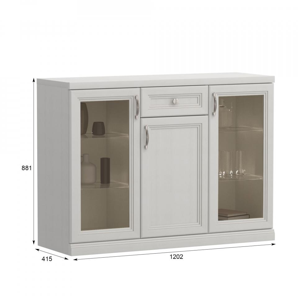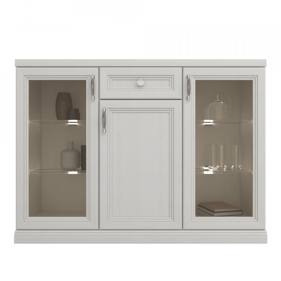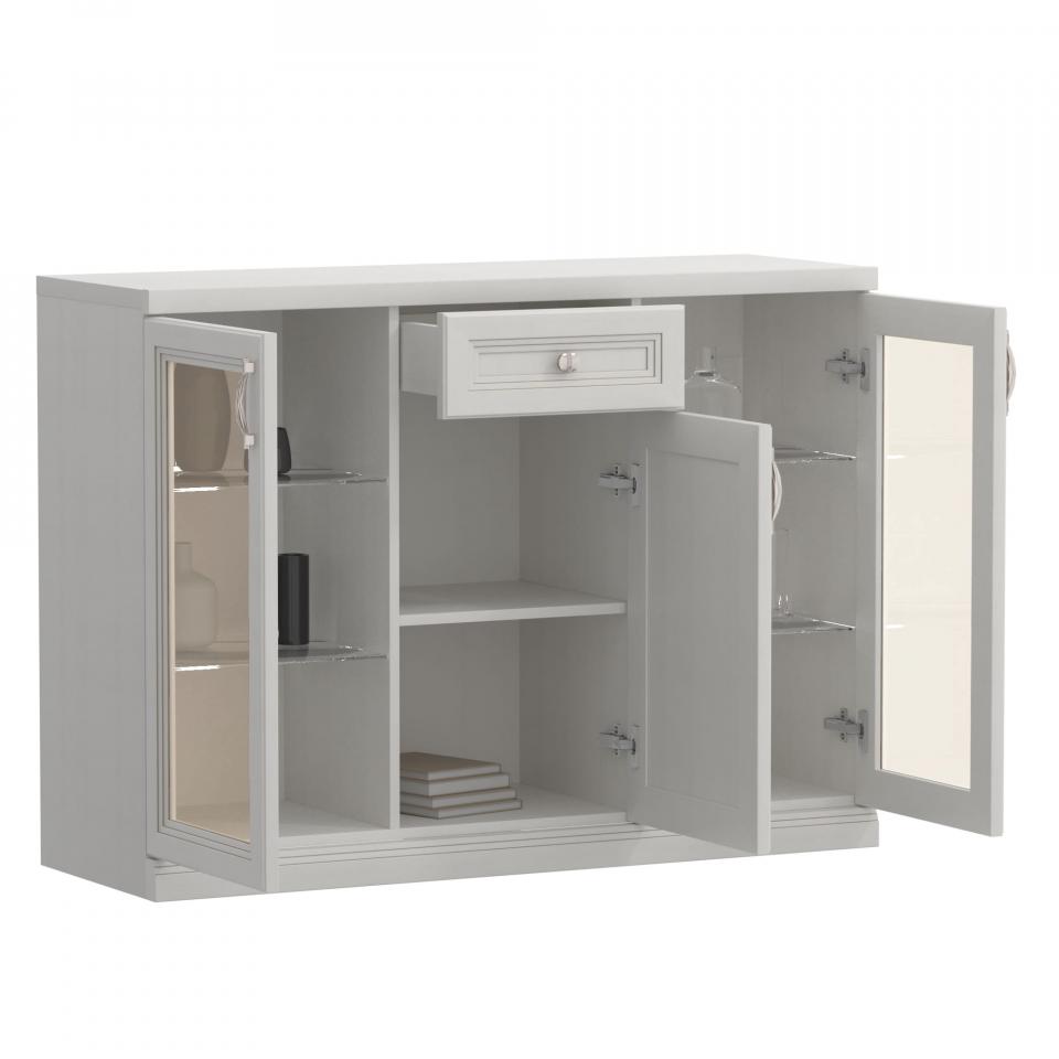 Витрины с подсветкой. По бокам расположены шкафы-витрины со стеклянными полками, на которые устанавливается подсветка. В них можно расставить предметы интерьера и ценные вещи, или использовать в качестве бара. Ящик и шкаф. По центру комода предусмотрен шкаф с полкой и небольшой выдвижной ящик для хранения вещей и аксессуаров. Петли с доводчиками. Двери закрываются плавно и бесшумно. Невидимые направляющие Квадро с доводчиками. Направляющие устанавливаются на дно ящика и при открывании не видны. Доводчики в системе обеспечивают плавное, бесшумное открывание и закрывание ящика.