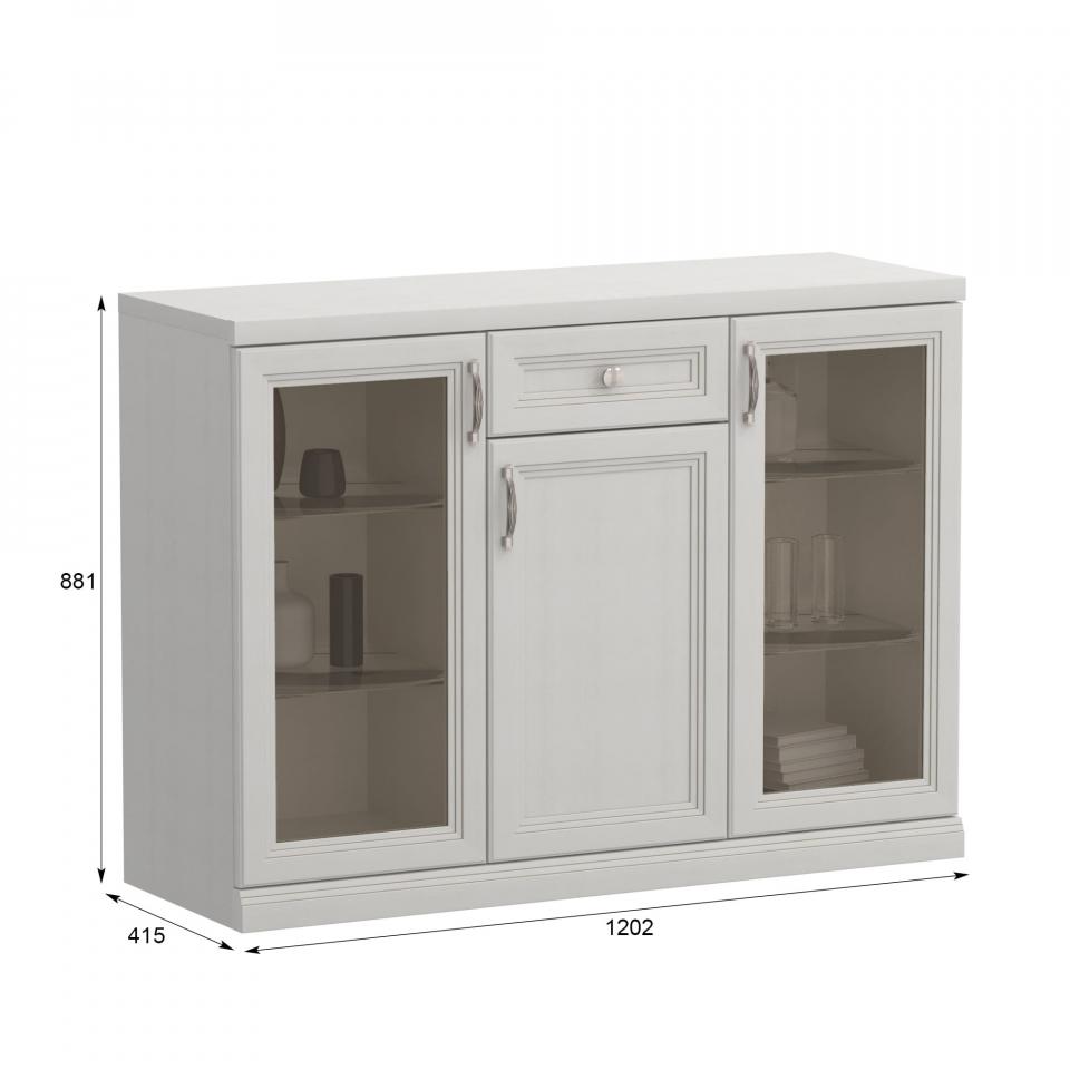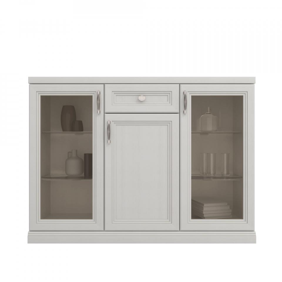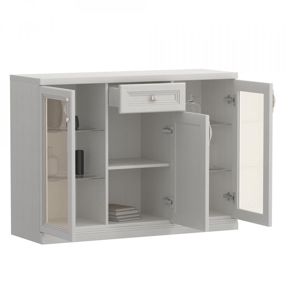 Витрины с подсветкой. По бокам расположены шкафы-витрины со стеклянными полками, на которые устанавливается подсветка. В них можно расставить предметы интерьера и ценные вещи, или использовать в качестве бара. Ящик и шкаф. По центру комода предусмотрен шкаф с полкой и небольшой выдвижной ящик для хранения вещей и аксессуаров. Петли с доводчиками. Двери закрываются плавно и бесшумно. Невидимые направляющие Квадро с доводчиками. Направляющие устанавливаются на дно ящика и при открывании не видны. Доводчики в системе обеспечивают плавное, бесшумное открывание и закрывание ящика. Внимание! Адаптер для работы подсветки в комплект не входит. Для подключения светильников необходимо выбрать шкаф или комод в вариантах исполнения «дп», «бп», «сп» с адаптером в комплекте.