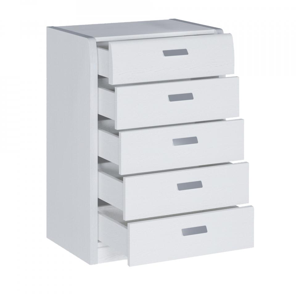 Пять ящиков. Удобное и рациональное хранение белья и аксессуаров в одном месте. Панель верхнего ящика выполнена из профиля МДФ. Панели нижних ящиков выполнены из ЛДСтП 18 мм. Направляющие Квадро с доводчиками. Направляющие устанавливаются на дно ящиков и при открывании не видны. Доводчики в системе обеспечивают плавное и бесшумное закрывание ящиков. Регулируемые опоры позволяют скорректировать неровности напольного покрытия.