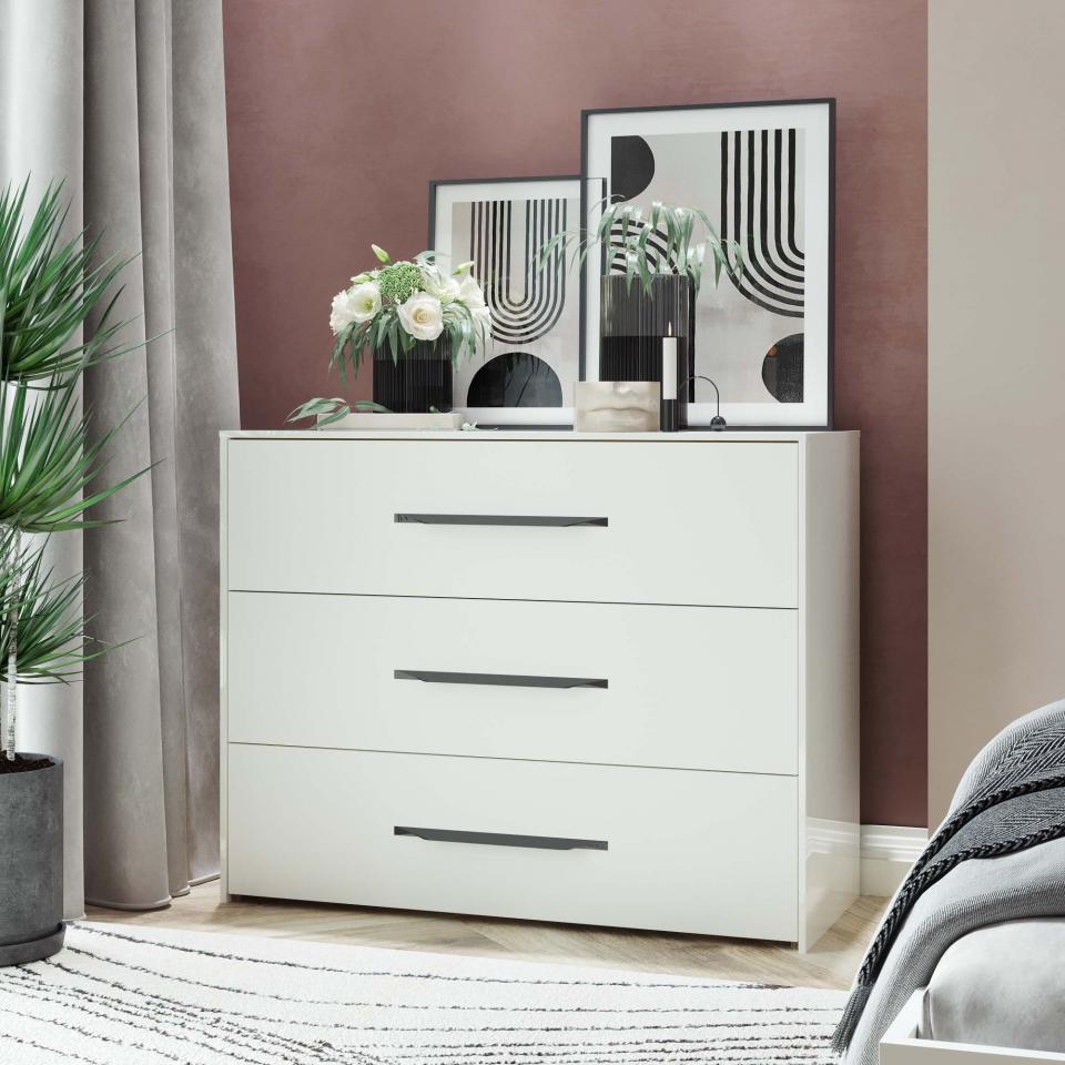 Внутренний корпус в цвете «лючента коричневый». Эксклюзивный вариант внутреннего оформления является дизайнерской особенностью серии, эффектно сочетается с иным цветом внешних стенок и фасадов. Фасад с прочным покрытием. Стильная комбинация фасадов и декоративных стенок освежит пространство спальни, позволяя подобрать оптимальное сочетание цвета и оттенков, наиболее подходящее для вашего интерьера. Три выдвижных ящика. В широких ящиках достаточно места для хранения сложенной одежды, личных вещей и аксессуаров. Чёрные металлические ручки. Оригинальные формы ручек перекликаются по стилю и цвету с ручками, вешалками и крючками других модулей коллекции. Европейская фурнитура с доводчиками и пожизненной гарантией от «Лазурит». Ящики открываются и закрываются максимально плавно и бесшумно.