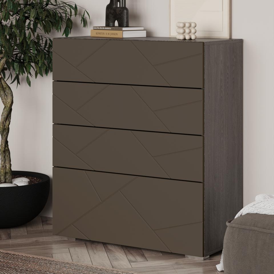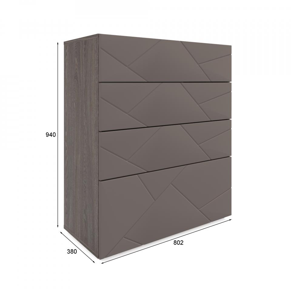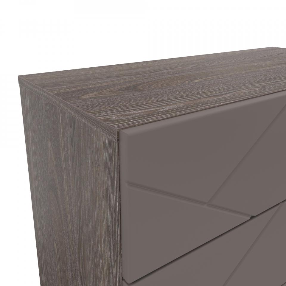 Модная комбинация цветов. Матовые фасады в цвете «Софт графит» разбавлены древесной текстурой корпуса. Четыре выдвижных ящика. Пригодятся для хранения личных вещей, предметов одежды, текстиля, документов, аксессуаров.