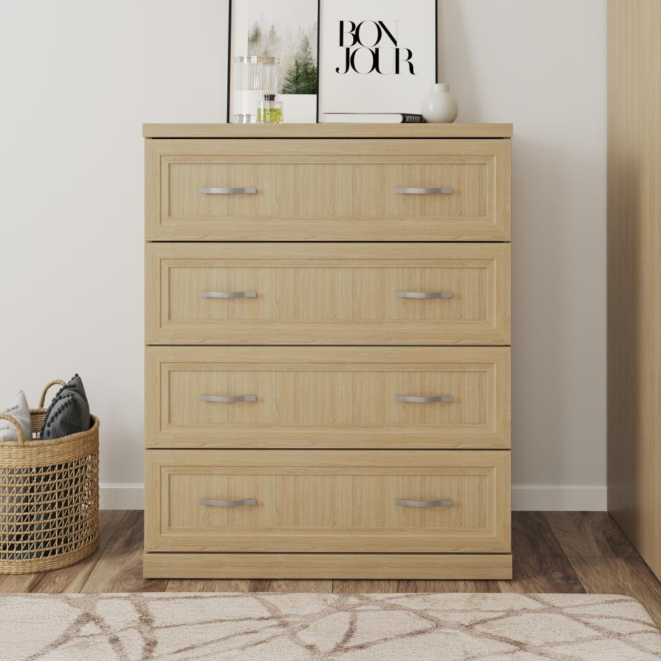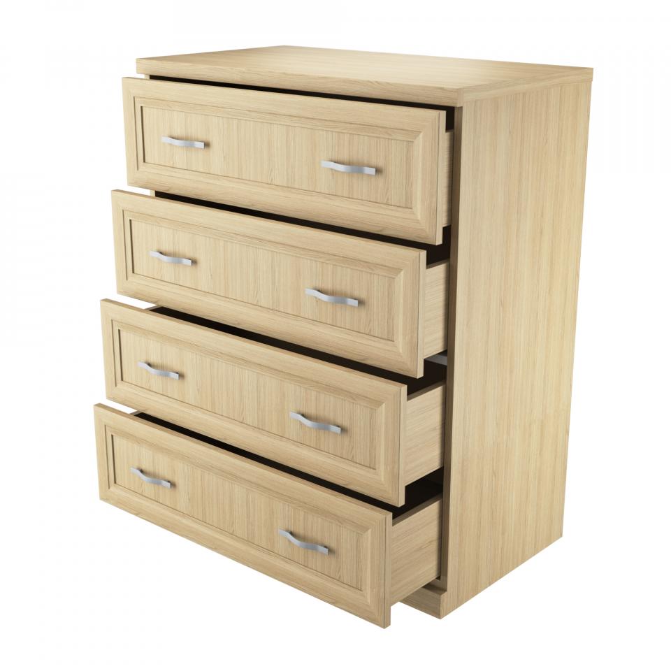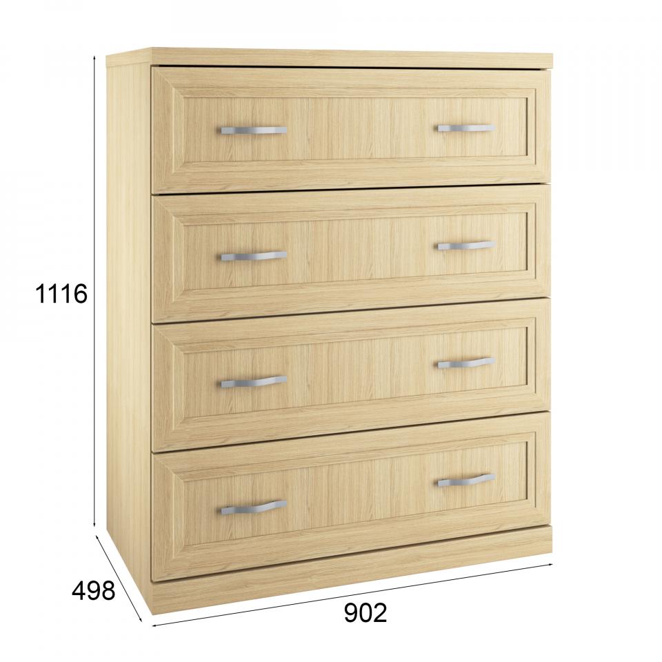 Четыре вместительных ящика. Удобное хранение сложенной одежды, белья и постельных принадлежностей. Направляющие с доводчиками. Ящики открываются и закрываются плавно и бесшумно. Прочная столешница. Комод можно использовать как ТВ-тумбу, поставив на него небольшой телевизор в спальне. Или можно расставить предметы интерьера и поставить уютную декоративную лампу.