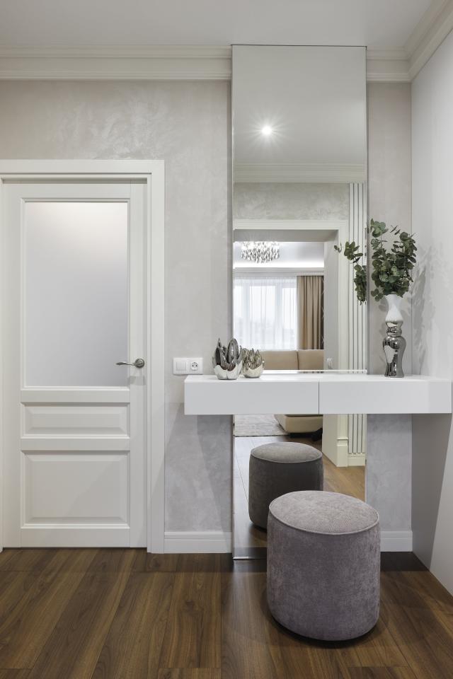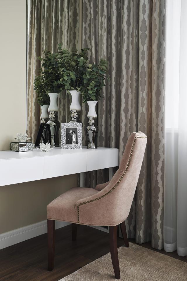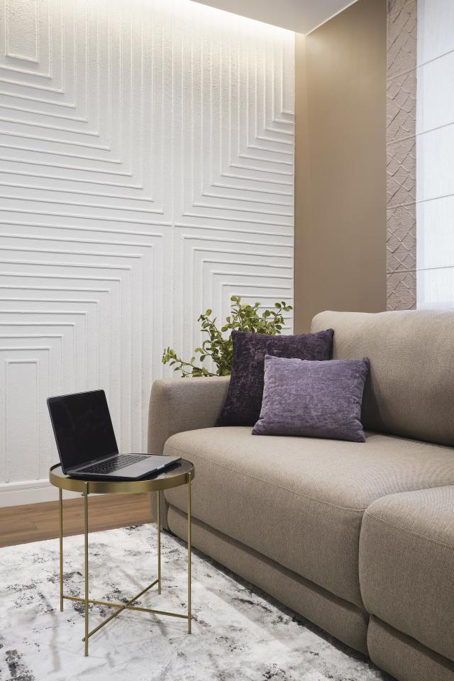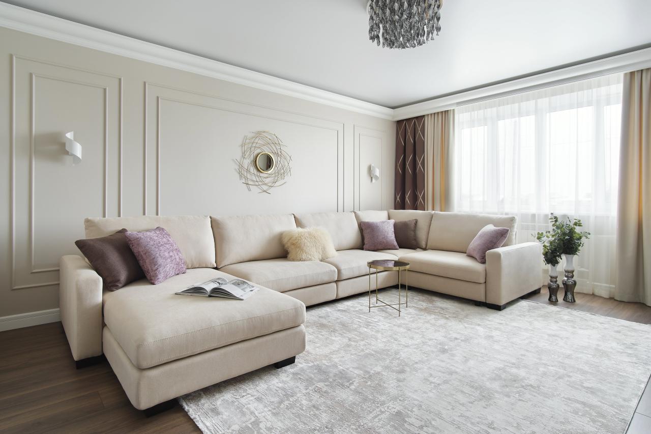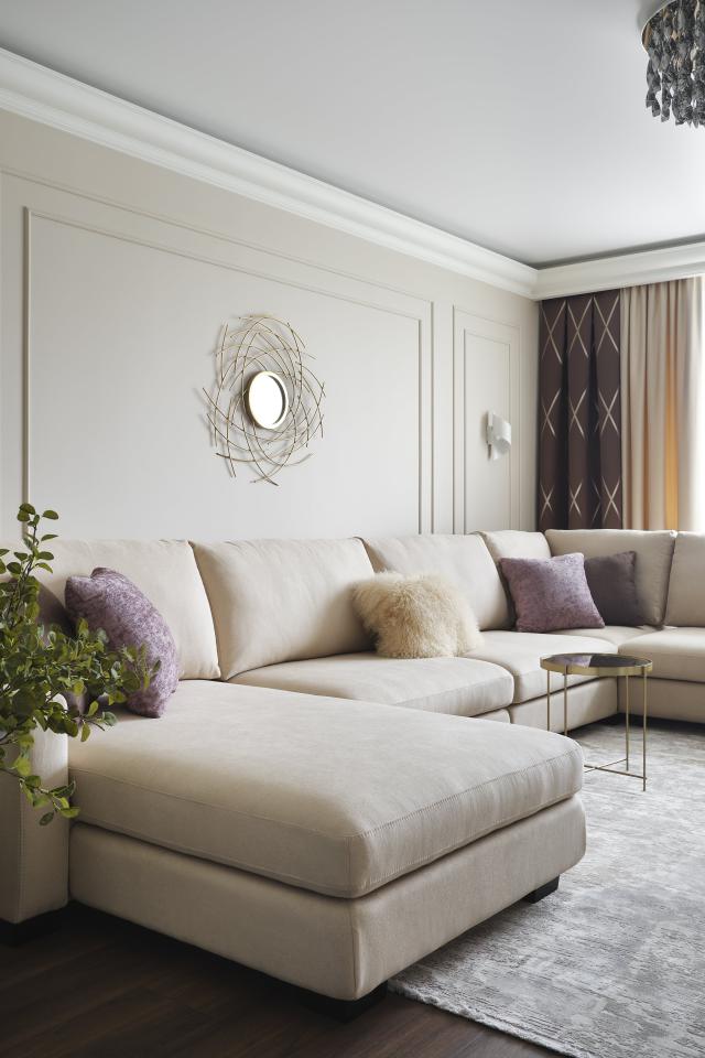 Интерьер выглядит лёгким и воздушным за счёт использования светлых и спокойных оттенков. Обогатить его визуально призваны в данном случае различные фактуры. Этот приём давно перешёл из разряда тенденций в устойчивую потребность современных заказчиков. Одной из них стал диван Дюссельдорф. Все интерьерные решения, в том числе и в мягкой мебели, выбирали согласно главному пожеланию заказчиков: эргономичность и функциональность. Диван оснащён "шагающей подушкой спинки". Таким образом, легко регулировать глубину сидения. Модель имеет модульную конструкцию - клиент собирает его, как конструктор Lego, под потребности своей семьи и параметры помещения.