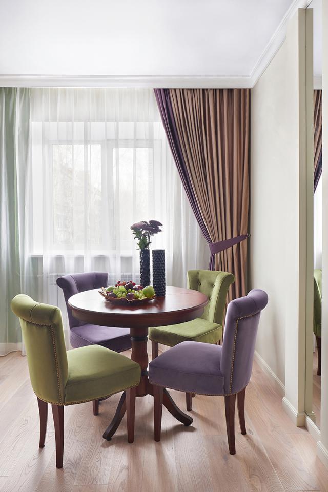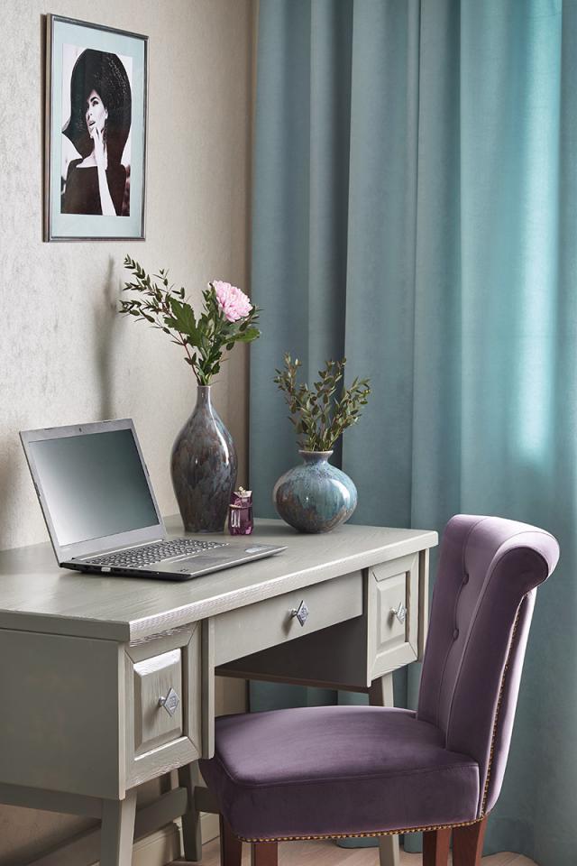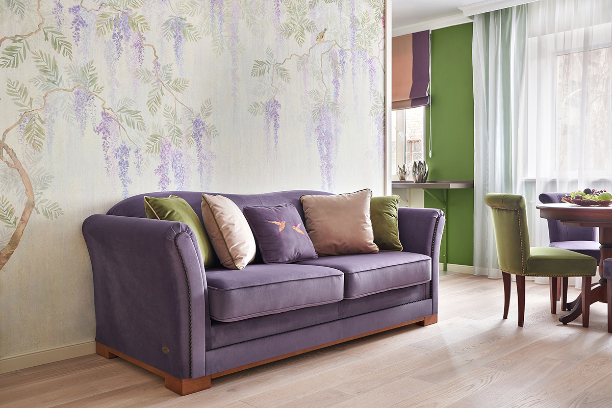 Дизайнер Ксения Новосёлова решила использовать цвет лаванды и молодой зелени — они создают в доме ощущение весны. Должен был получиться вечно цветущий райский сад с поющими птицами, чтобы поддерживать настроение легкости.