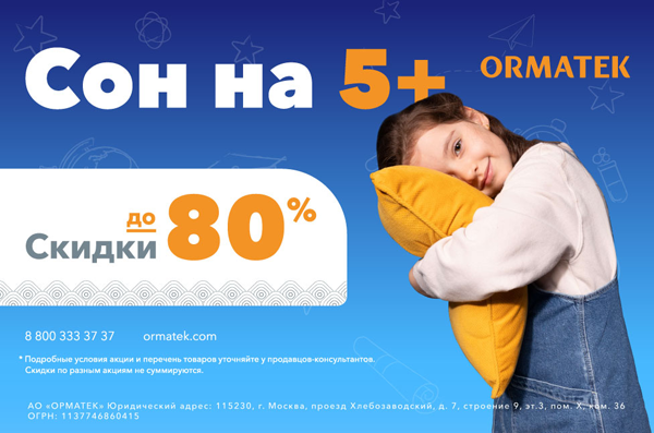 Родители следят за режимом сна, мы — за комфортом. Зная, сколько всего нужно закупить перед первым сентября, ORMATEK позаботился и о родителях ORMATEK запускает акцию «Сон на 5+» — скидки до 80% на товары для качественного сна школьника: